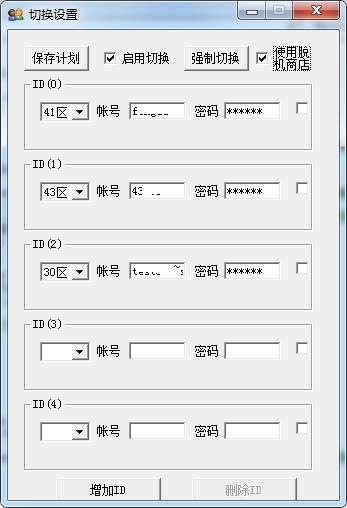 “切换设置”:可实现多个游戏帐号自动切换挂机打怪。切换条件包括DA不足、死亡次数用完、当日杀怪数达到上限等。点击“切换设置”将弹出新窗口,在此窗口中设置待切换游戏帐号列表,包括游戏区、帐号、密码。有两种方式为待切换游戏帐号挂DA,方式一:勾选“使用脱机商店”,需为每个帐号运行一个对应的“勇者决战迷你客户端(脱机商店)”,包括正通过游戏客户端进入游戏的帐号,也需有输入好游戏区、帐号、密码的对应脱机商店。方式二:取消“使用脱机商店”选项,则通过外挂的ID列表点击“进入”按钮,挂入脱机,成功挂入后列表会变色,且有当前DA值显示。注意:须勾上“启用切换”才有效,外挂会根据脱机帐号的DA值选择切换帐号。