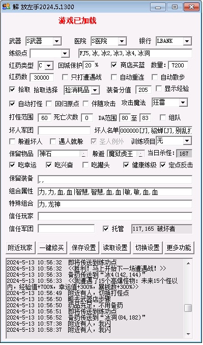 开始使用:设置好武器店、医院、银行、练级点,拾取方式等,勾上“托管”,即可自动开始打怪练级